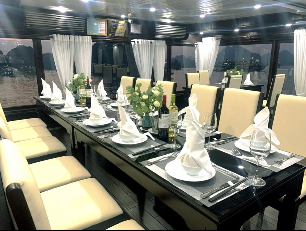 ⏰19h00: Đoàn dùng bữa tối tại nhà hàng với những món ăn hải sản của Hạ Long. Sau bữa tối đoàn tự do nghỉ ngơi hoặc tham gia các chương trình đêm của tầu như: xem phim hoặc câu mực, câu cá đêm ….