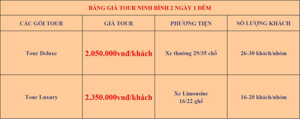 Dưới đây là CHƯƠNG TRÌNH NINH BÌNH 2 NGÀY 1 ĐÊM với lịch trình BÁI ĐÍNH – TRÀNG AN – HOA LƯ – TAM CỐC, được thiết kế đặc sắc – hấp dẫn – trọn vẹn trải nghiệm văn hóa, tâm linh và thiên nhiên: