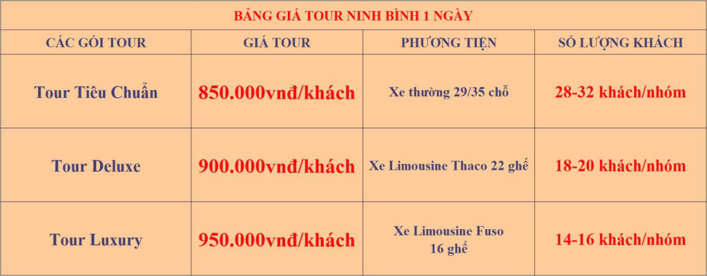 Dưới đây là chương trình du lịch 1 ngày đặc biệt kết hợp 3 điểm nổi tiếng nhất Ninh Bình: Tuyệt Tình Cốc – Tràng An – Hang Múa, mang đến trải nghiệm vừa hùng vĩ, vừa thơ mộng, vừa “đỉnh cao sống ảo”. Lịch trình hợp lý, hấp dẫn, thích hợp cho du khách yêu thiên nhiên, thích khám phá và chụp ảnh.