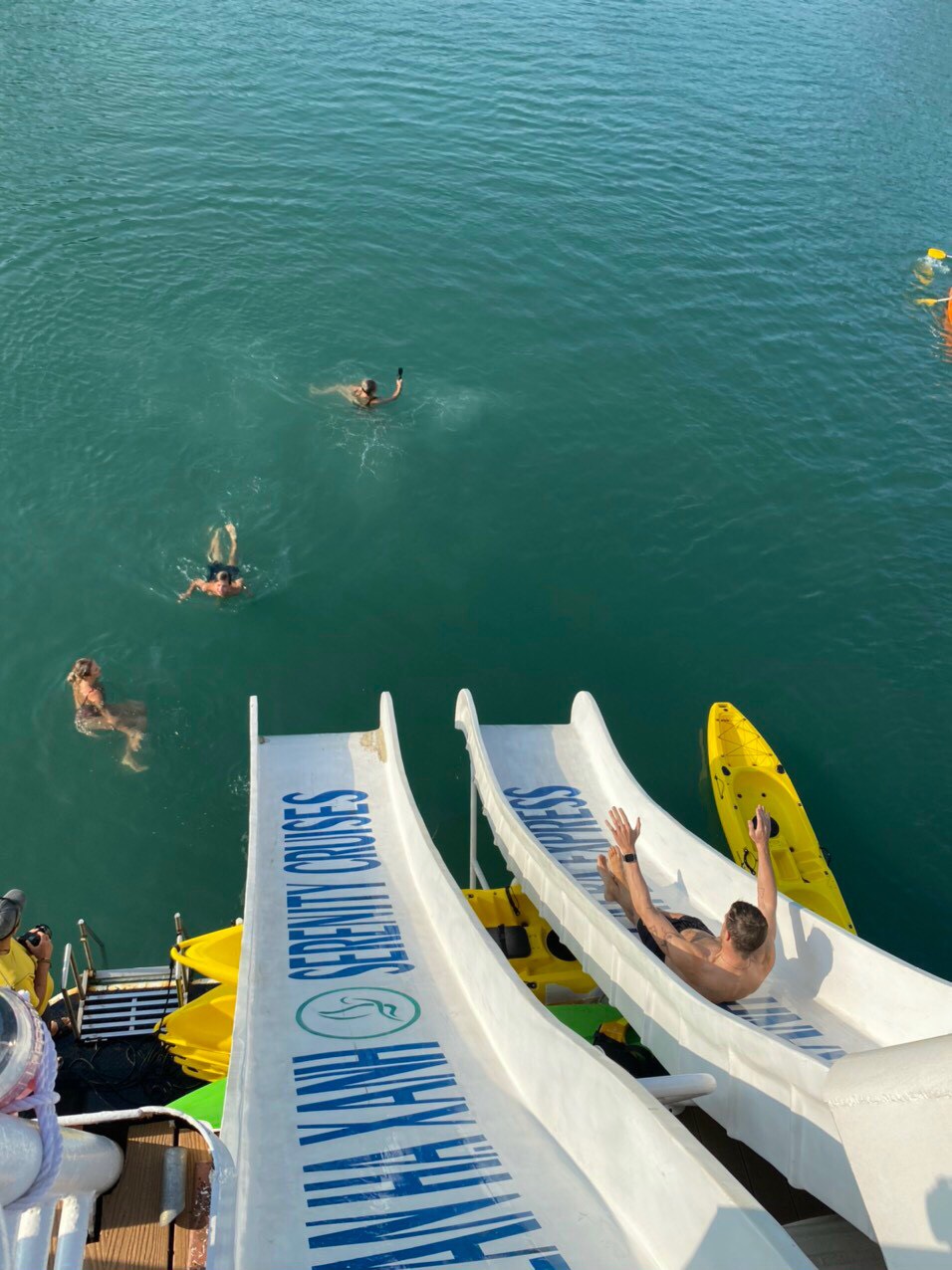✅Khi di chuyển sâu vào vùng lõi (nơi đẹp nhất của vùng vịnh) thuyền trưởng của chúng tôi sẽ chọn hải trình men theo làng chài Di Sản để đến với khu vực thuận lợi nhất để thả neo. Du khách trải nghiệm trượt cầu trượt, tắm bơi, chụp hình, lưu lại những khoảnh khắc tuyệt vời nhất trên hải trình “Chạm Miền Di Sản”.